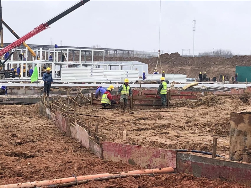 2月10日,農(nóng)歷正月初十,大雪過后,地面泥濘。隔離區(qū)項目現(xiàn)場管理人員及施工人員精神抖擻、有條不紊地開展施工作業(yè),持續(xù)推進打包房、折疊房和板房的安裝,水電配套同步進行。