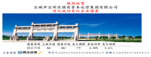 12月2日 ,我公司“2020年宣城市宣州區(qū)國有資本運(yùn)營集團(tuán)有限公司企業(yè)債券”成功發(fā)行。本次債券由國元證券有限公司主承銷,發(fā)行規(guī)模3.6億元,發(fā)行期限7年,主體評(píng)級(jí)AA,債項(xiàng)評(píng)級(jí)AA+,票面利率6.5%。本期債券為我集團(tuán)公司首次公開發(fā)行企業(yè)債券,也是宣州區(qū)內(nèi)企業(yè)首次公開發(fā)行企業(yè)債券。